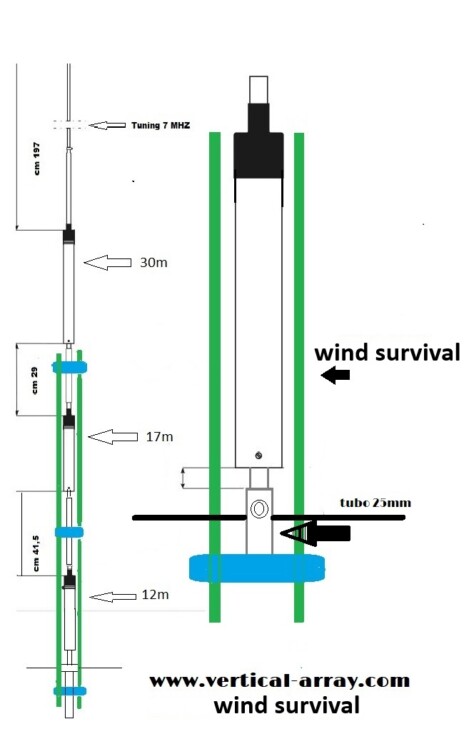 The antenna has been designed to operate on the HF bands 4-6-10-11*-12-15-17-20-30-40 meters.